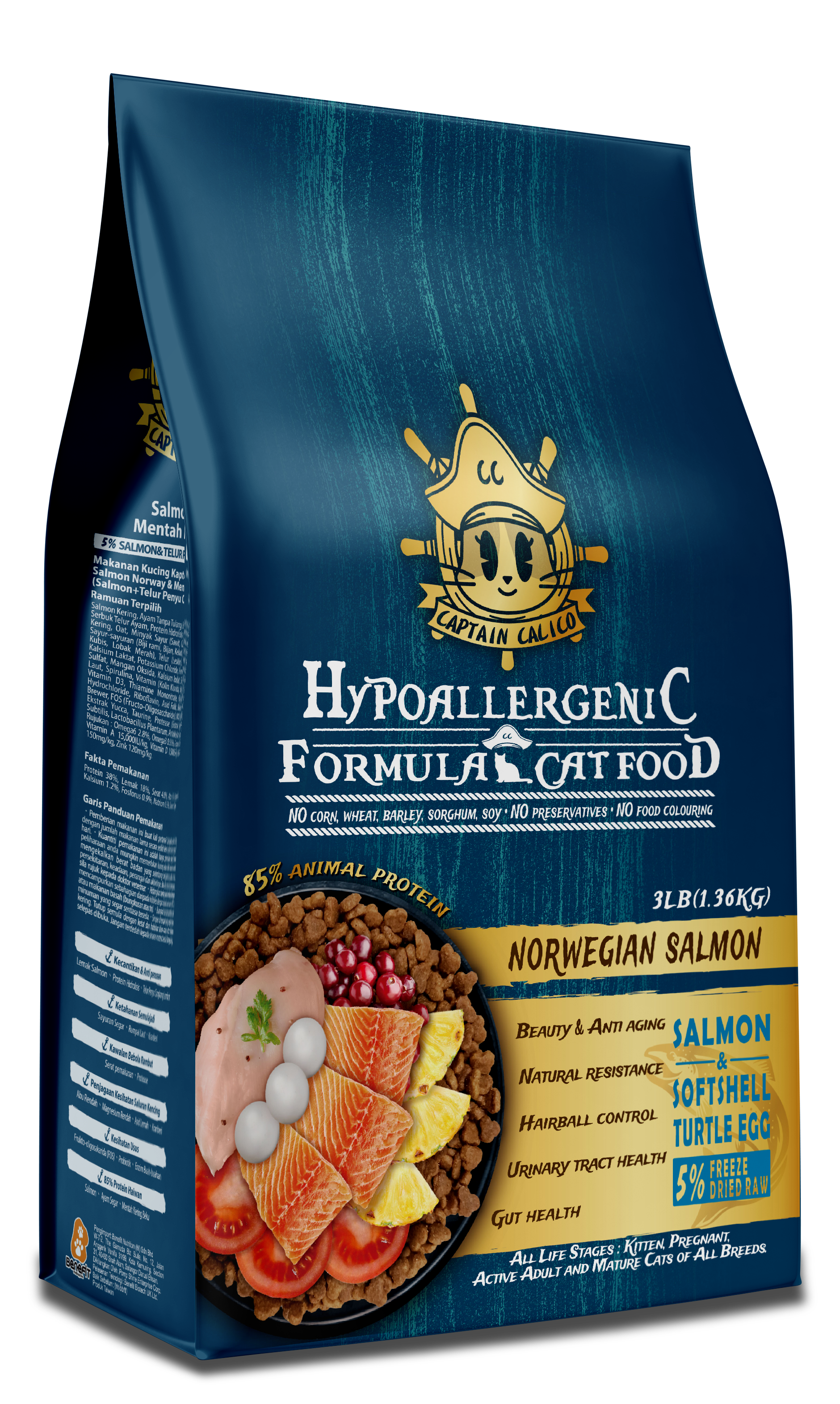 ♦ Ingredients : Dry Salmon, De-Boned Chicken, Brown Rice, Cassava, Chicken Fat, Chicken Egg Powder, Hydrolyzed Protein (Salmon/Chicken), Dried Beet Root, Oat, Vegetable Oil (Palm, Canola), Salmon Oil, Fish Skin, Vegetables (Flaxseed, Sesame, Yam, Great Burdock, Cranberry, Tomato, Cabbage, Carrot), Egg (Lecithin), Minerals (Dicalcium Phosphate, Calcium Lactate, Potassium Chloride, Ferrous Sulfate, Zinc Oxide, Copper Sulfate, Manganese Oxide, Calcium Iodate, Selenium Yeast Complex), Seaweed, Spirulina, Vitamins (Choline Chloride, Vitamin A, Vitamin E, Vitamin C, Vitamin D3, Thiamine Mononitrate, Calcium Pantothenate, Pyridoxine Hydrochloride, Riboflavin, Folic Acid, Biotin, Vitamin B12, Niacin), Brewer's Yeast, FOS (Fructo-Oligosaccharides), MOS (Monone-Oligosaccharides), Yucca Extract, Taurine, Protease (Papaya and Pineapple Extract), Bacillus Subtilis, Lactobacillus Plantarum, Natural Antioxidants (Vitamin E).
