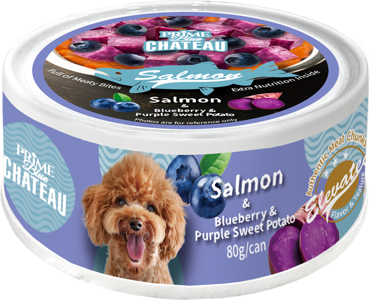 ♦ Ingredients : Ocean salmon (meat, bone, organs),water, purple sweet potato, pea protein, plant fiber, sweet potato, blueberries, salmon oil, soybean oil.